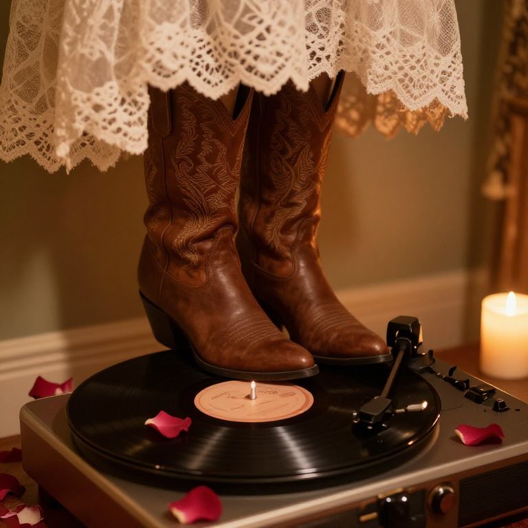 Stevie Nicks cowboy boots stepping on a vintage vinyl record player surface, surrounded by scattered rose petals and delicate lace, ambient candlelight casting soft glows, symbolizing classic rock aesthetic fused with romantic Victorian-inspired fashion, detailed textures