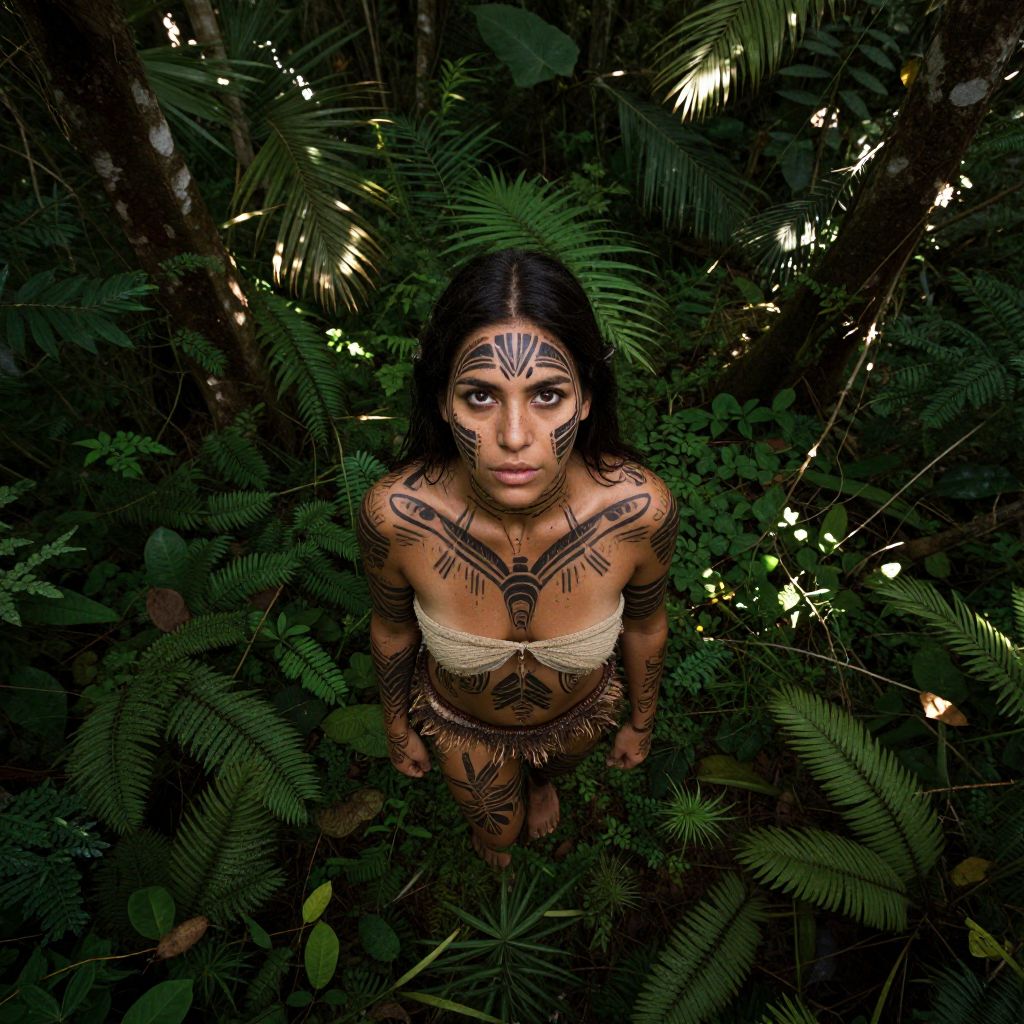 A captivating portrait photograph reveals an enigmatic woman adorned with intricate tribal markings and body art, standing amidst a lush rainforest. Captured from an aerial perspective, this image beautifully showcases her deep connection to nature, blending vibrant flora and fauna with the raw textures of her skin and clothing. The interplay of dappled sunlight through the canopy and her alluring gaze create a mesmerizing dance of light and shadow, evoking primal beauty and untamed wildness that invites viewers into this captivating world.
