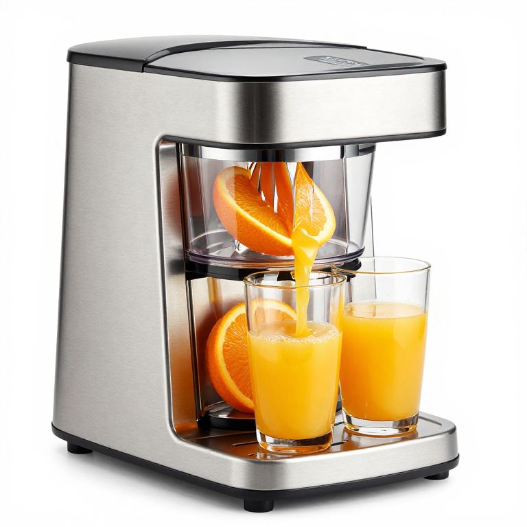 Sleek stainless steel automatic orange juicer extractor actively dispensing fresh orange juice into two transparent glasses while processing vibrant orange slices inside its transparent chamber.