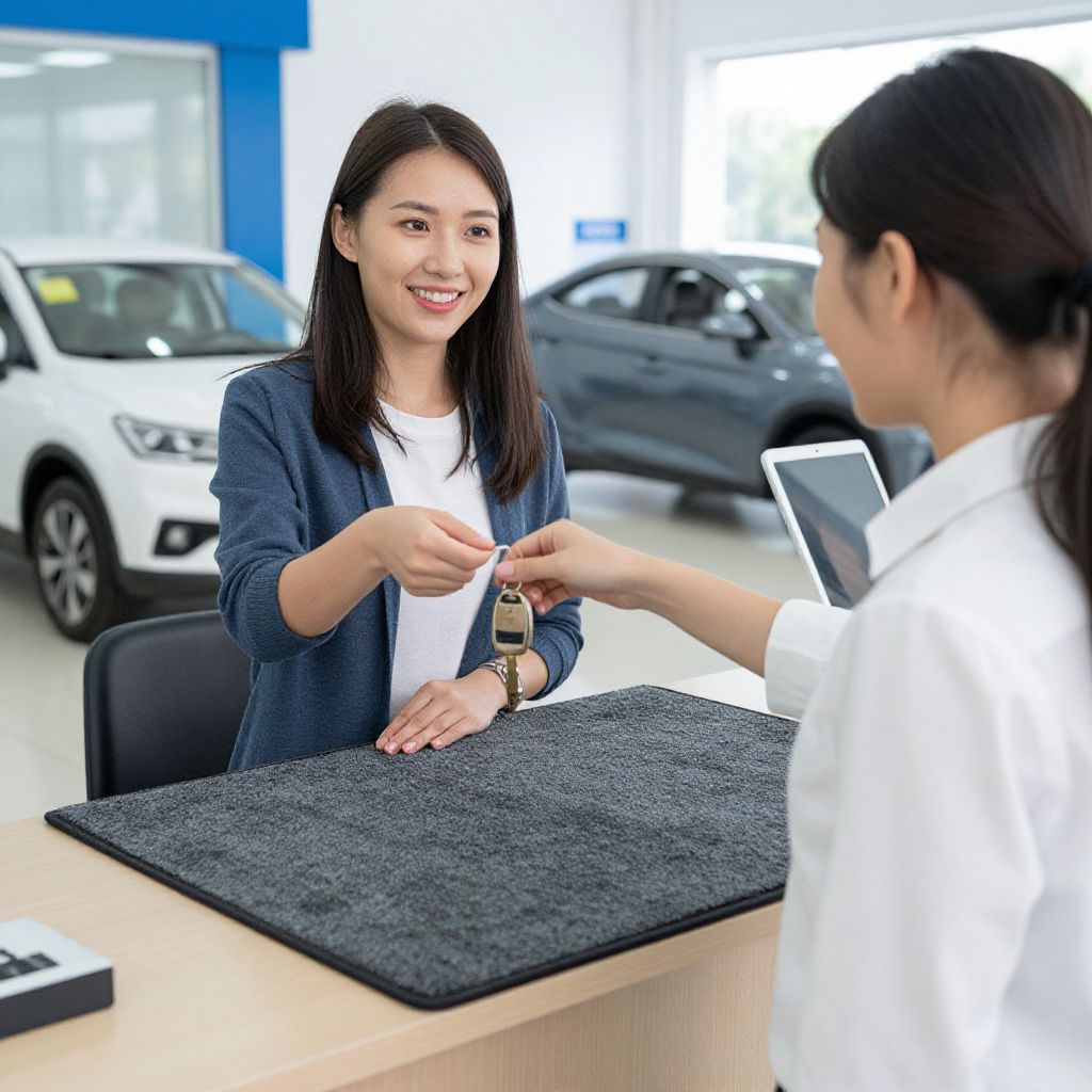 Photograph of an Asian woman in a blue blazer and white shirt, smiling, handing a key to a man in a white shirt at a car