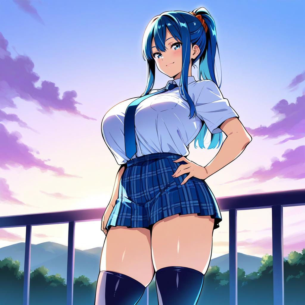 Takeda Hiromitsu style, 1girl, breasts, skirt, thighhighs, solo, blue eyes, necktie, school uniform, long hair, blue hair, ponytail, huge breasts, shirt, tented shirt, plaid, outdoors, plaid skirt, smile, hand on hip, looking at viewer, blue skirt, sidelocks, high ponytail, thighs, sky