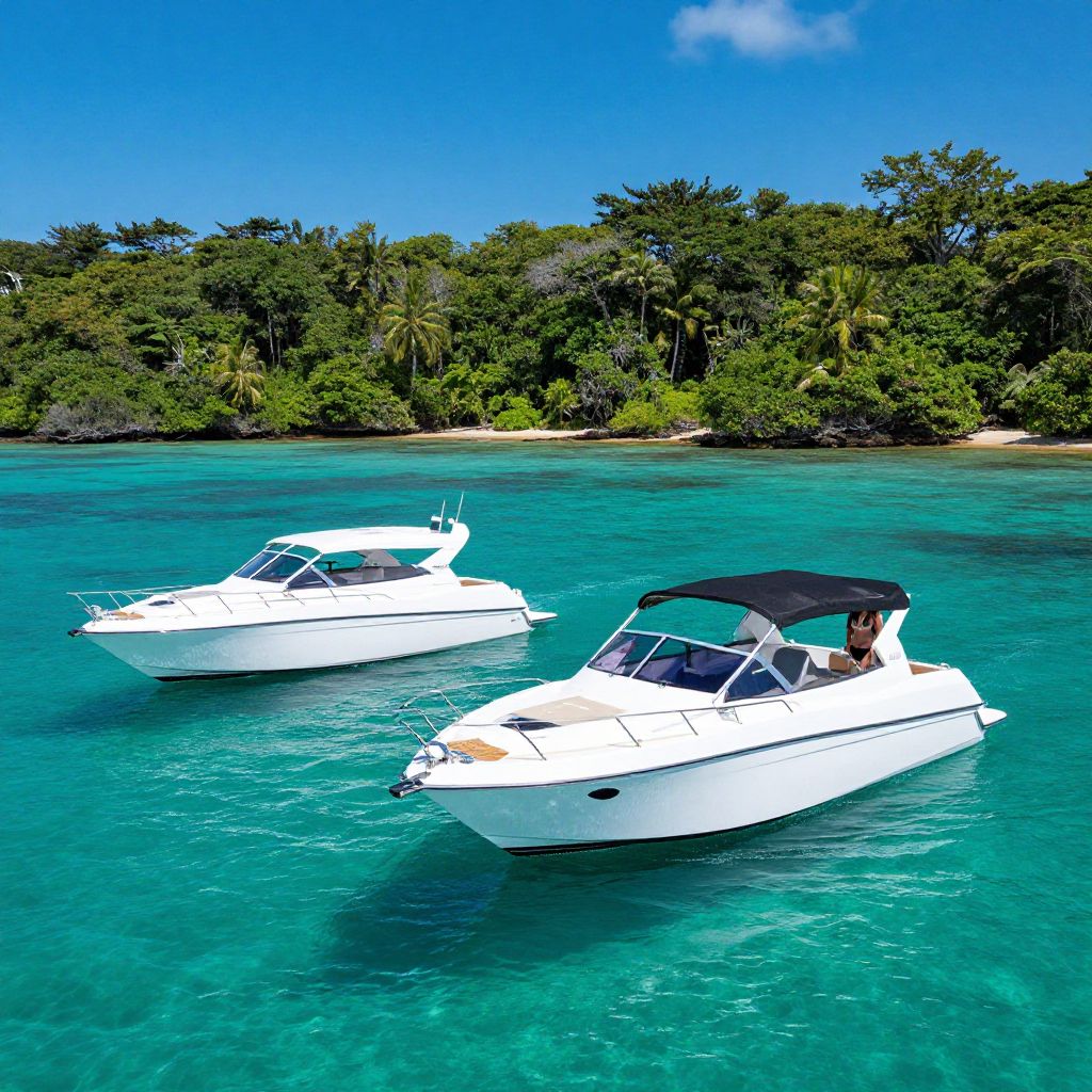 Two sleek white motorboats glide peacefully on crystal-clear turquoise waters, with one featuring a black canopy and a woman standing at the stern, while lush green rainforest borders the horizon under a vibrant blue sky.