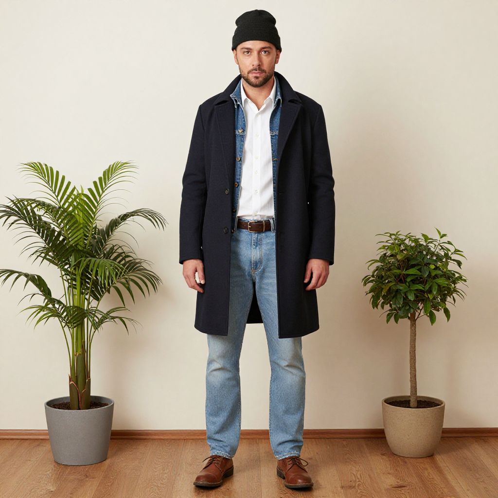 Photograph of a bearded man standing in front of a plain white wall. He wears a black beanie, white shirt, navy blue coat, blue jeans, and brown leather shoes. Two potted plants, one with long, slender leaves on the left and a smaller, bushy plant on the right, flank him on a wooden floor. The man's hands rest by his sides, and he looks directly at the camera with a neutral expression. The image is brightly lit, highlighting the clean, minimalistic setting.