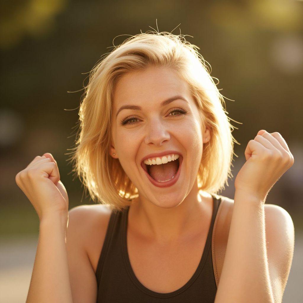 A joyful woman with short blonde hair is celebrating outdoors in golden sunlight, expressing pure happiness and excitement. The warm, natural lighting and shallow depth of field create a lively and uplifting atmosphere.