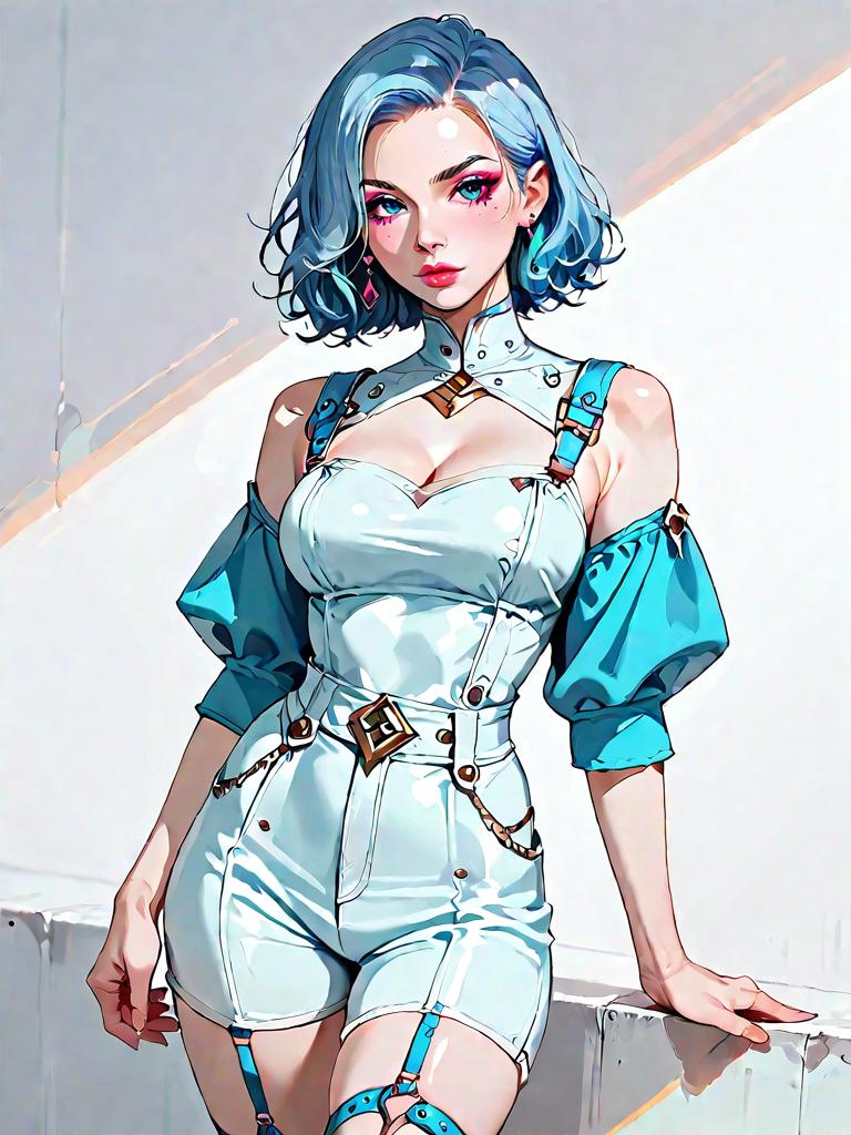 1girl, realistic face, Fitted leather bralette, adjustable straps, deep V-neck, rich burgundy hue, soft matte texture, coordinating latex shorts, high-rise style, electric blue shade, smooth surface, decorative buckles, playful pleats, modern chic vibe.