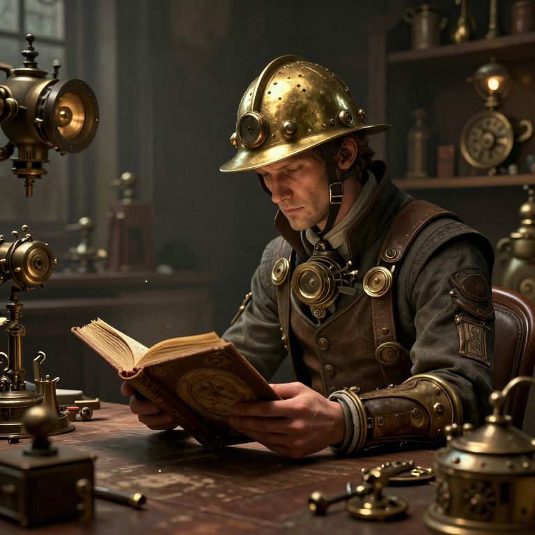 Steampunk soldier in brass helmet and dark uniform reads book at wooden table, surrounded by brass gadgets and clockwork devices.