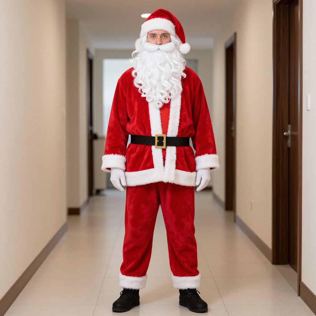 Photograph of a person standing in a long, narrow, beige-tiled hallway. They are dressed in a full Santa Claus costume, including a red velvet suit with white fur trim, black belt with gold buckle, black boots, white gloves, and a red Santa hat with white fur. They have a full, curly white beard and are looking directly at the camera. The hallway has white walls, dark brown doors, and a ceiling light in the background. The person's face is visible, with neutral expression. The costume is detailed and festive, contrasting with the plain hallway setting.