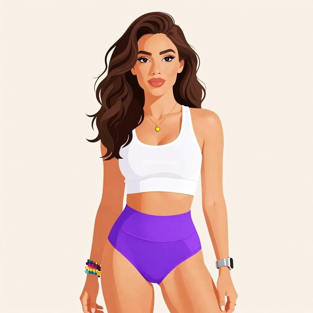 Digital illustration of a confident woman with long brown hair, wearing a white crop top, high-waisted purple panties, and colorful bracelets.
