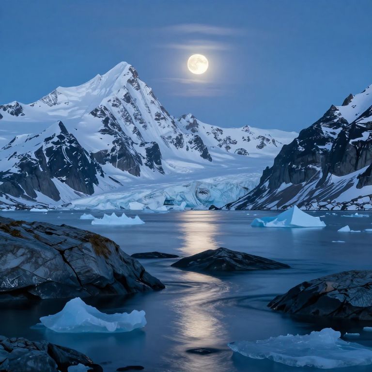 Moonlit peaks rise majestically above a serene icy landscape, their snow-covered slopes reflecting the ethereal glow of a full moon as tranquil waters flow between jagged rocks and floating icebergs.