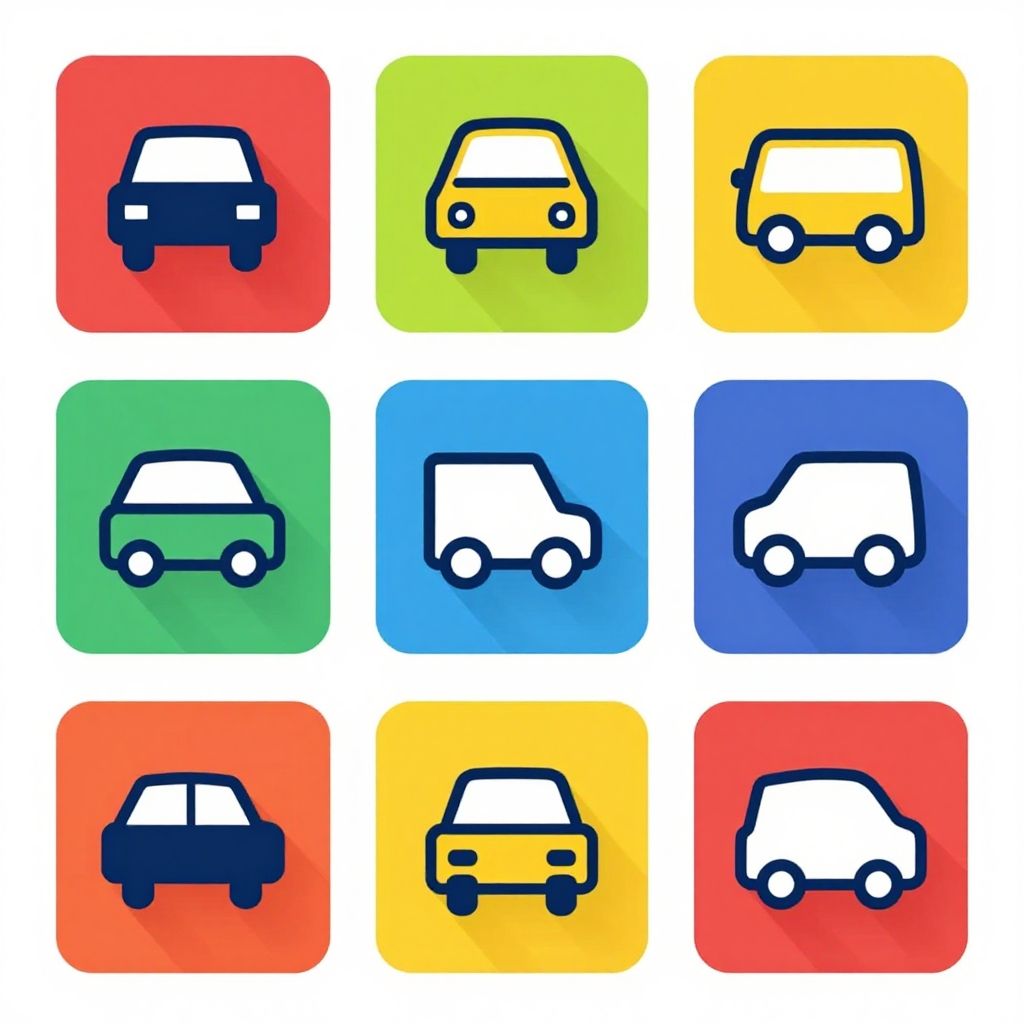 Nine colorful square icons depicting simplified, black-outlined cars in white and yellow, arranged in a 3x3 grid on red, green, yellow