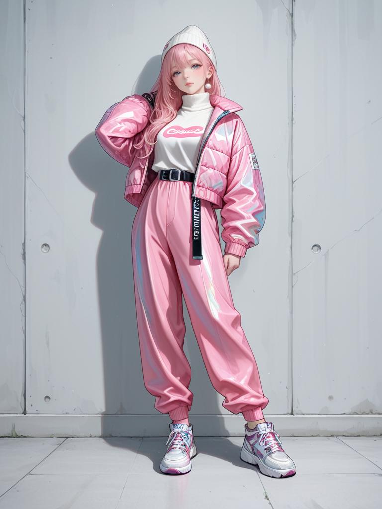 1girl, realistic face, full body shot, Woman, athleisure with a trendy twist, light pink turtleneck top with text print, matching pink tracksuit with geometric patterns, elastic waistband with black belt and silver buckle, cuffed ankles, metallic iridescent sneakers, puffer jacket slung over one shoulder, beanie hat, white studio background.