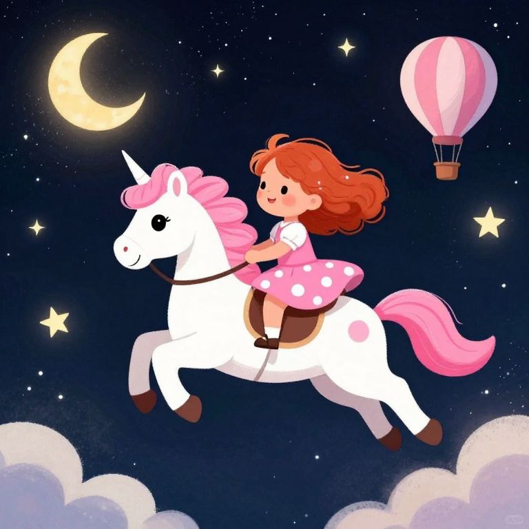 In this whimsical and enchanting illustration, a happy and cute girl with curly red hair is joyfully riding a flying unicorn in the night sky. The girl, wearing a charming polka dot pink dress, appears to be in a state of pure delight as she soars through the starry expanse. The unicorn, with its vibrant pink and white spotted coat, is depicted in mid-flight, its mane and tail flowing freely in the wind. Surrounding them are various celestial elements, including a crescent moon, a hot air balloon, and a cluster of stars, all adding to the magical atmosphere. The scene is set against a dark, starry background, with fluffy clouds scattered throughout, creating a sense of depth and dimension. The overall composition is balanced and harmonious, with the girl and unicorn as the central focus, while the surrounding elements enhance the sense of wonder and adventure.