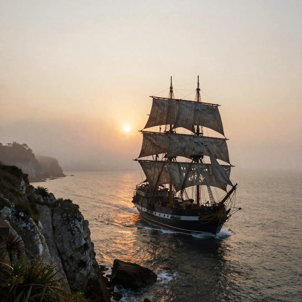 In a fog-shrouded coastal cliffside, a weathered tall ship with torn sails sails gracefully across the horizon, as the sun sets, casting a warm glow over the water, captured in a moody cinematic watercolor.