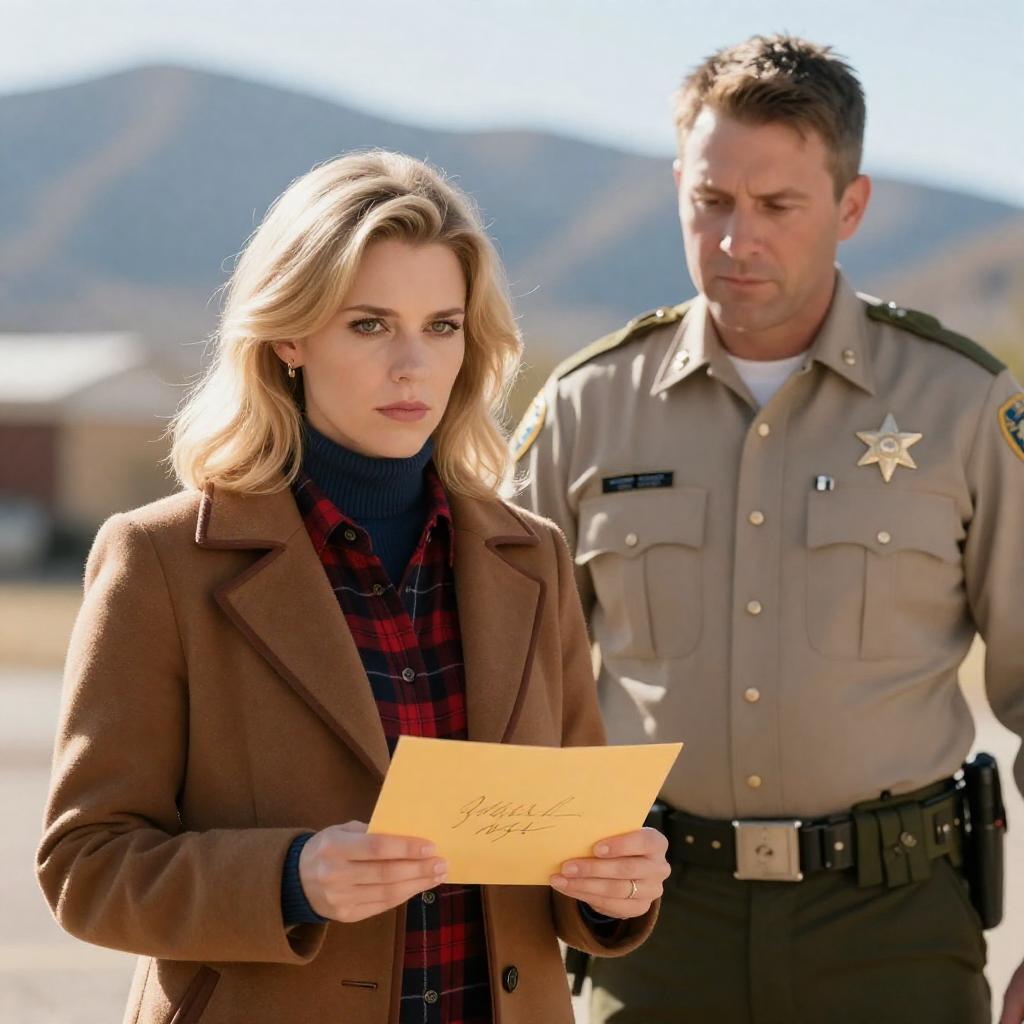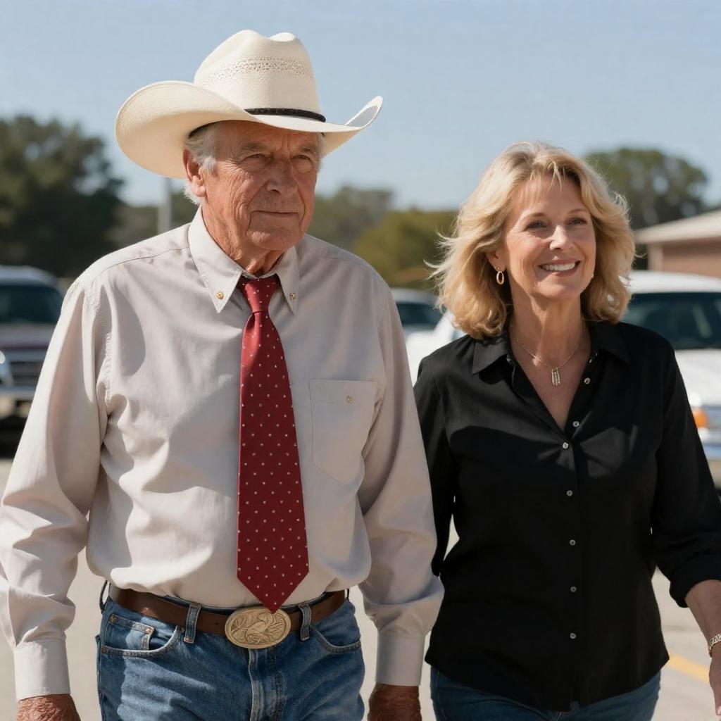 Photograph of an older man and a blonde woman standing next to a white police car with a red light. The man wears a white hat, light shirt, black tie with white dots, and a police badge. The woman wears a brown top with a v-neck, smiling at the man. The man looks serious. Clear blue sky in the background. Both are positioned on the left and right of the police car.