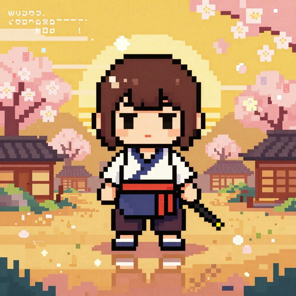 Pixel art chibi samurai girl in sunset Japanese village, using warm gold and cherry blossom 16-color palette, retro 8/16-bit arcade vibe, sharp pixel edges, clean 1px outlines, deliberate checker dithering, subtle CRT bloom and scanlines, layered parallax tiles, soft pastel haze, tiny HUD glyphs, subpixel highlights on key features, balanced contrast, centered portrait sprite, reflections and light glints, consistent tile seams, nostalgic game intro energy