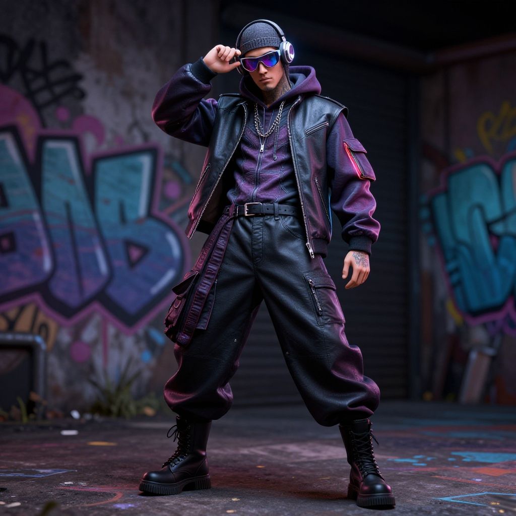 Photograph of a young man standing confidently in a graffiti-covered, dimly-lit urban alley. He wears a black leather jacket with red accents over a purple hoodie, black cargo pants with multiple pockets, and black combat boots. He sports a black baseball cap, blue-tinted sunglasses, and a silver chain around his neck. His right hand adjusts his cap, while his left hand rests by his side. The background features colorful graffiti on worn, concrete walls, with a metal shutter door slightly ajar. The overall aesthetic is edgy and urban, with a focus on street style and attitude.
