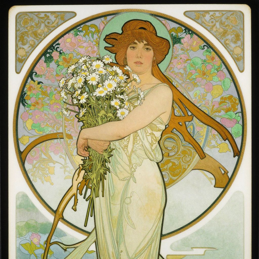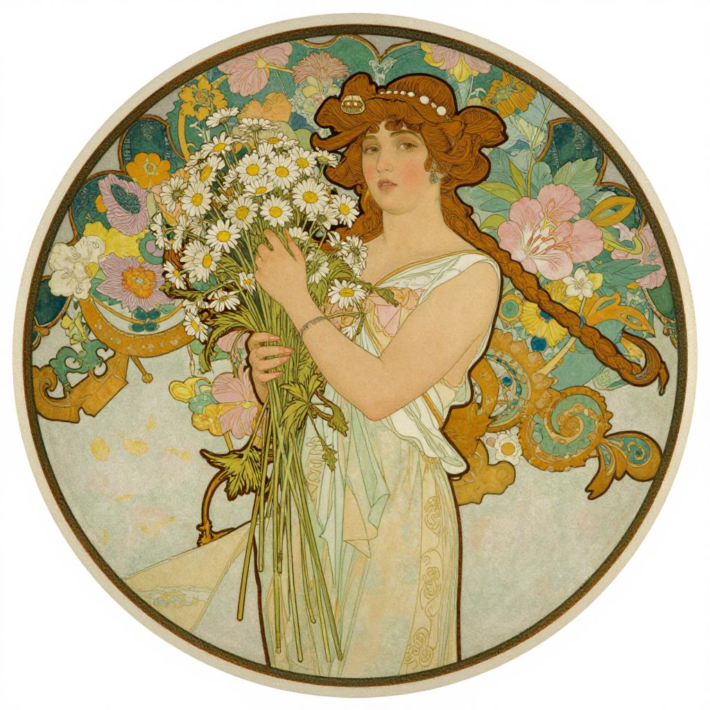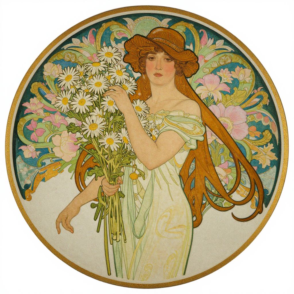 Woman depicted in an Art Nouveau style plate, gracefully holding a daisy bouquet against a vibrant floral background, adorned with intricate green and gold patterns.