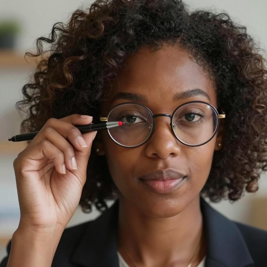 A Black woman with short curly hair, wearing a sleeveless white dress, standing in a kitchen. She looks down at a piece of paper in her hands. Shelves with jars and dishes in background. Coffee maker on the counter. Curtains on the right. She wears a wristwatch on her left wrist.