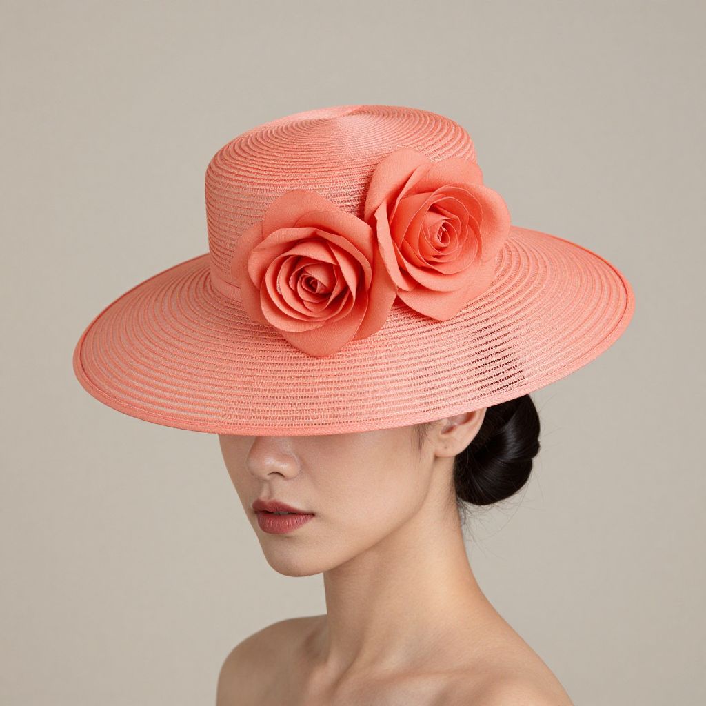 Photograph of a woman with fair skin, wearing a large, textured, coral pink sunhat adorned with two large, realistic rose blooms, against a