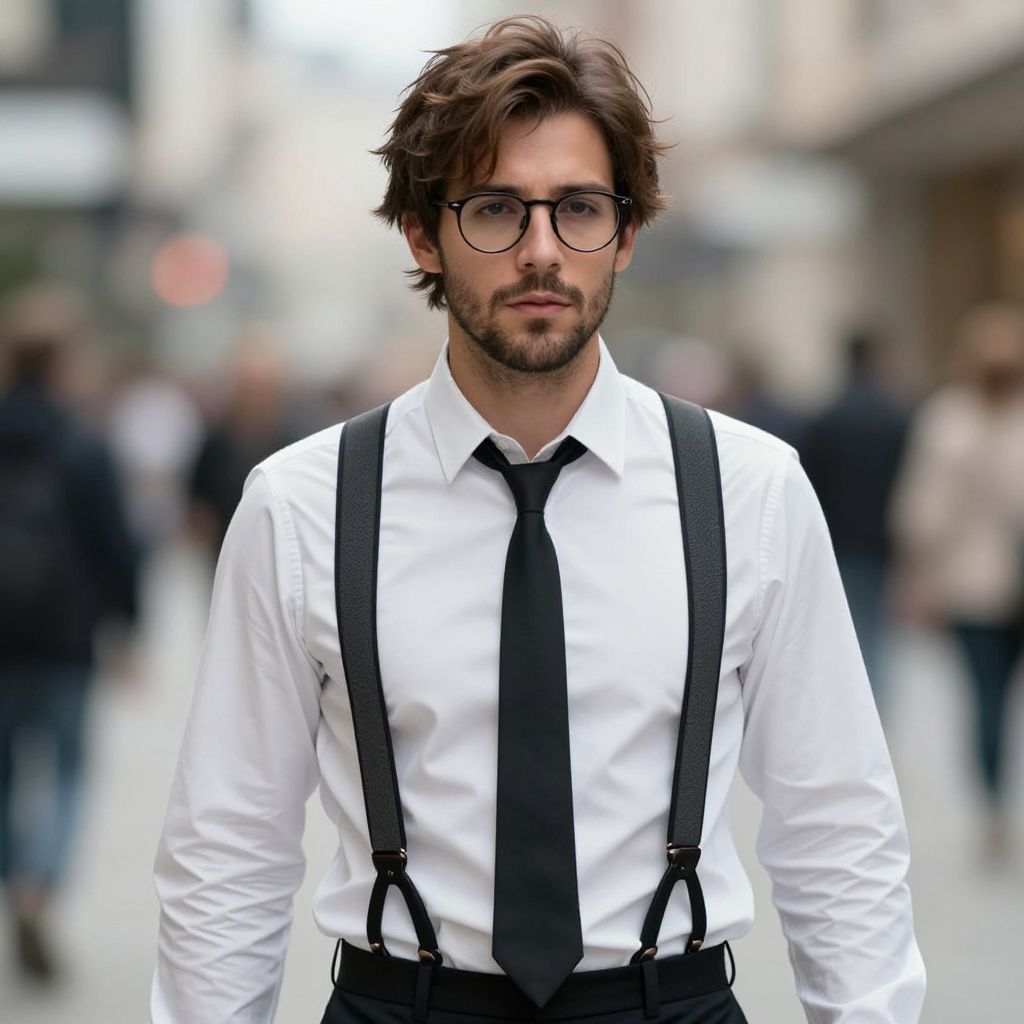 Luca costume, 1boy, male focus, necktie, solo, glasses, shirt, facial hair, blurry background, suspenders, outdoors, belt, blurry, white shirt, black necktie, brown hair, collared shirt, realistic, day