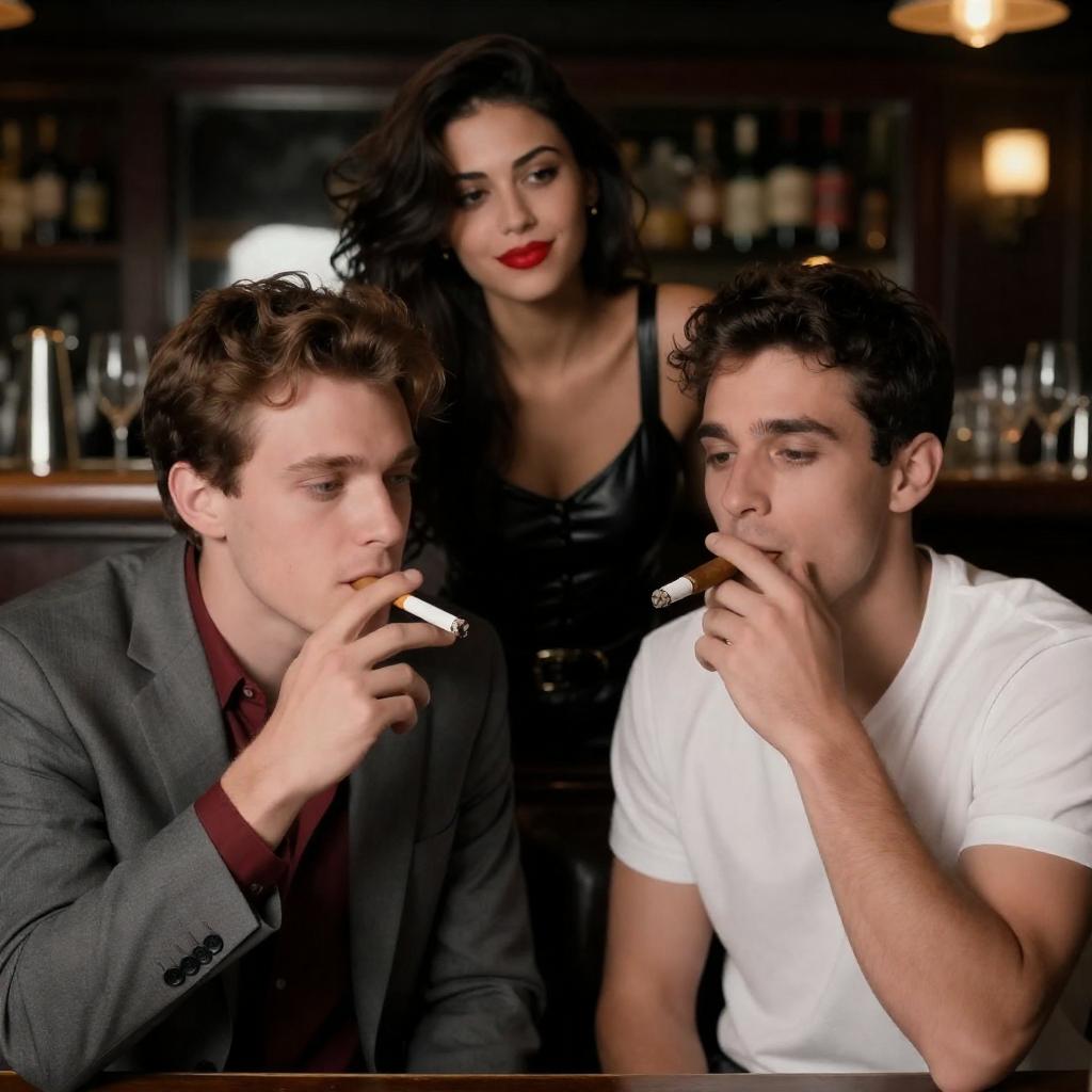 Group of six people in dimly lit theater, wearing formal attire. Central bearded man in dark suit smiles. Woman next to him with long brown hair smokes cigarette. Man on right holds cigarette to mouth. Background people partially visible.