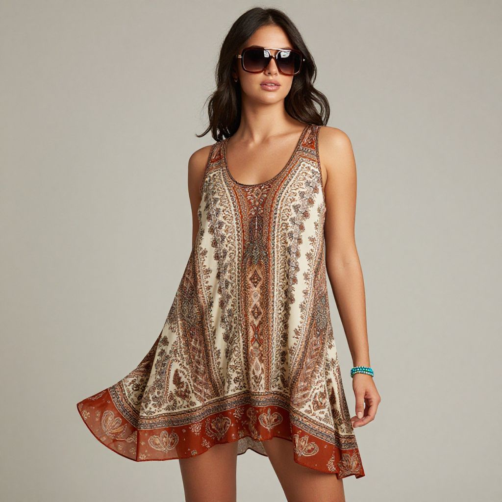 "Woman, bohemian, sleeveless A-line mini dress with earth-toned paisley and ethnic prints, scoop neckline, flowy silhouette, lightweight fabric, shades of brown, cream, and rust, turquoise beaded bracelet, oversized sunglasses with tinted lenses.. Sexy. Pretty face and beаutiful eyes. Big breasts."