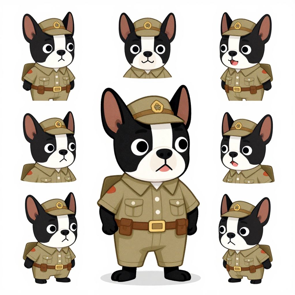 Italic boston terrier character, multiple poses and expressions, children book, wearing a park ranger uniform - no outline,