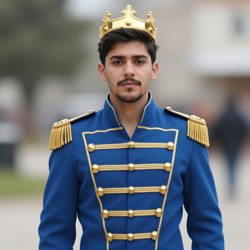 Photograph of a young South Asian man with fair skin and dark, neatly combed hair, wearing a royal blue military-style uniform with gold epaulettes and buttons, and a gold crown. He has a mustache and a serious expression. The uniform features ornate gold stripes running vertically down the front. The background is blurred, showing an outdoor setting with indistinct trees and buildings. The image has a slightly over-saturated color effect, emphasizing the vivid blue of the uniform and the golden details. The man stands centered in the frame.
