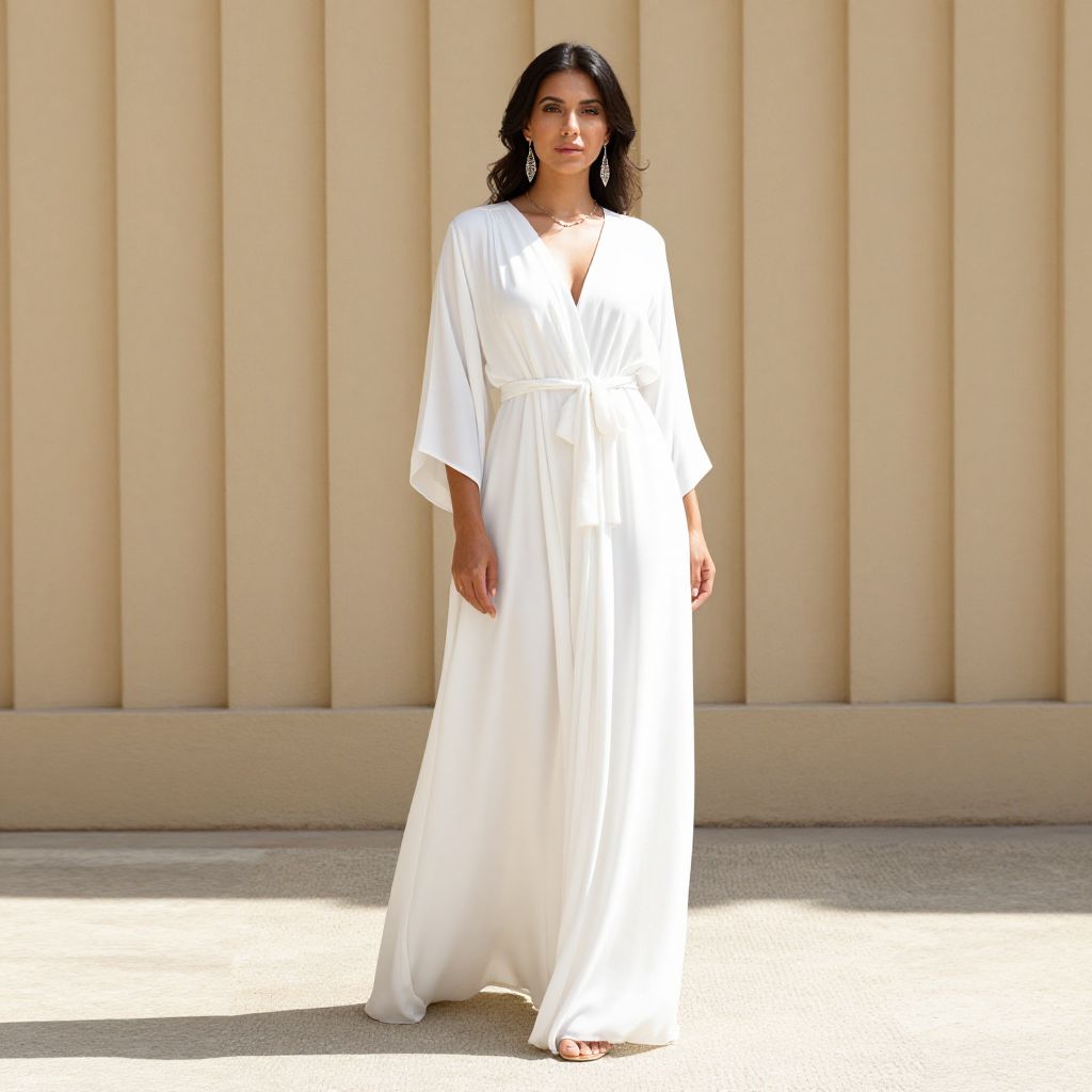 Woman standing gracefully in front of a vertical-striped beige wall, wearing a flowing white caftan with a deep V-neck and tied waist, accessorized with dangling earrings and a delicate necklace, casting a shadow on the textured concrete ground beneath her.