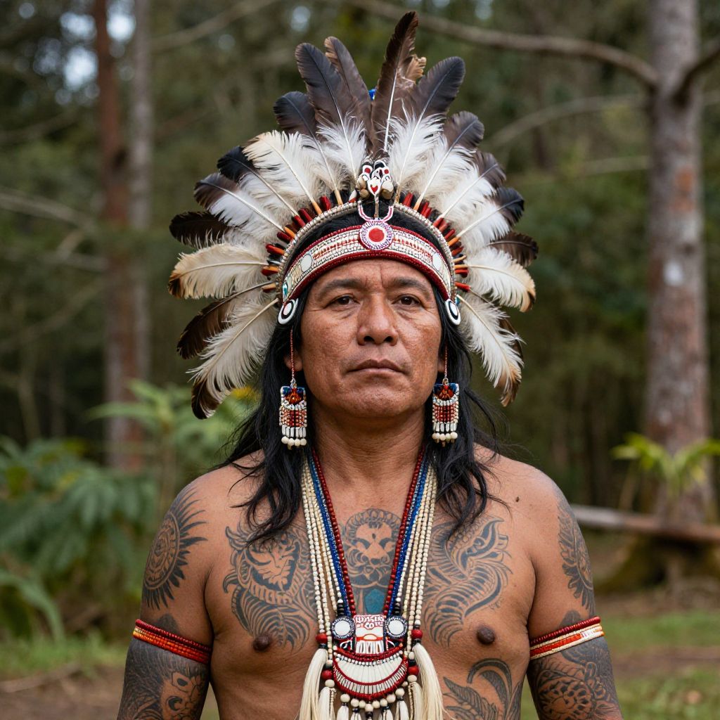 A powerful image featuring a proud Indigenous man dressed in traditional attire, adorned with a stunning feathered headdress. His intricate tattoos and ceremonial jewelry reflect a deep cultural heritage, set against a serene forest backdrop.