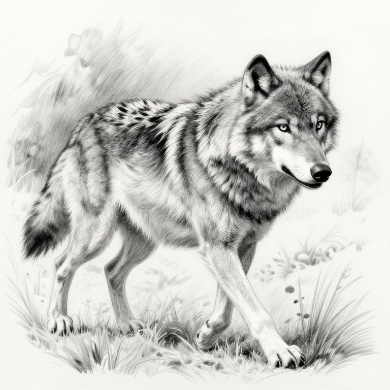 Black and white digital drawing of a wolf standing in grass. The wolf has a detailed, textured fur coat with dark and light stripes, sharp ears, and piercing eyes looking to the right. Its muscular body and paws are prominently shown, with grass tufts beneath its feet. The background is mostly white with some subtle, abstract grassy textures. The style is highly detailed and realistic, with a focus on the wolf's natural beauty and strength. The image has a dynamic, sketch-like quality with visible brush strokes.
