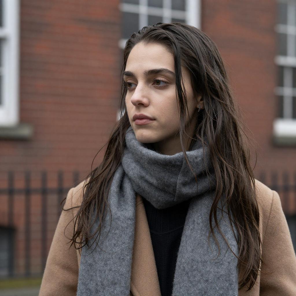 Photograph of a young woman in the foreground, wearing a grey knitted beanie, multicolored scarf, and fur-trimmed coat. Background shows blurred group of people, including a person with a camera, and another with a plaid coat. Neutral, outdoor urban setting.