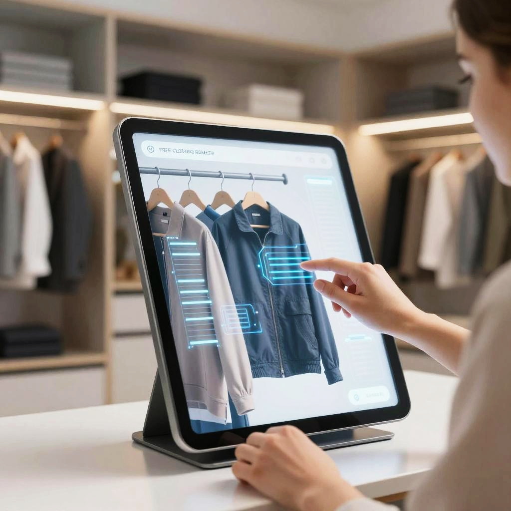 Free clothing remover interface displayed on a transparent touchscreen, user selecting clothes to remove digitally, futuristic UI elements with data streams and holograms, background of advanced smart wardrobe, clean and tech-savvy atmosphere