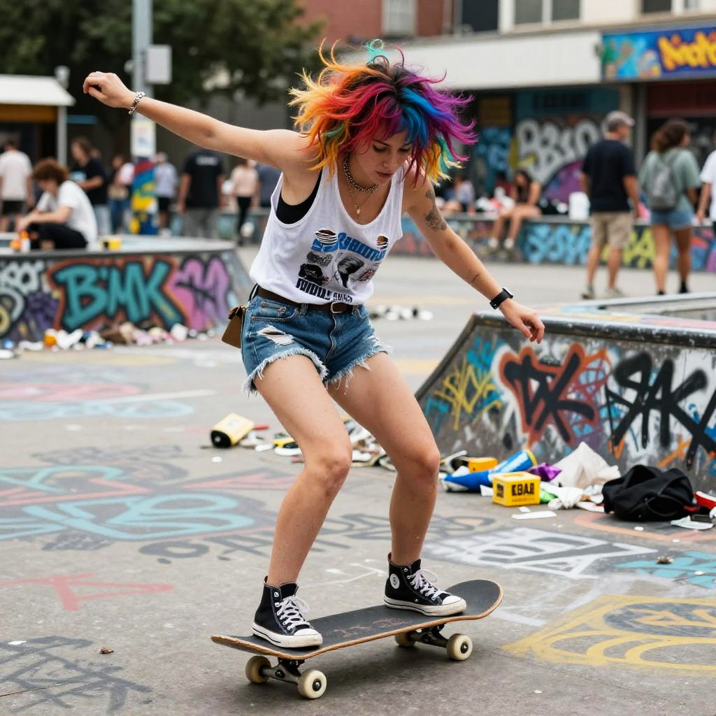 Realistic photo.Sassy and trashy photograph of a rebellious skateboarder, wearing a ripped tank top, colorful hair, skating in a chaotic urban park filled with graffiti and litter, cinematic film still, Kodak Portra, carefree and unruly vibe. realistic photo