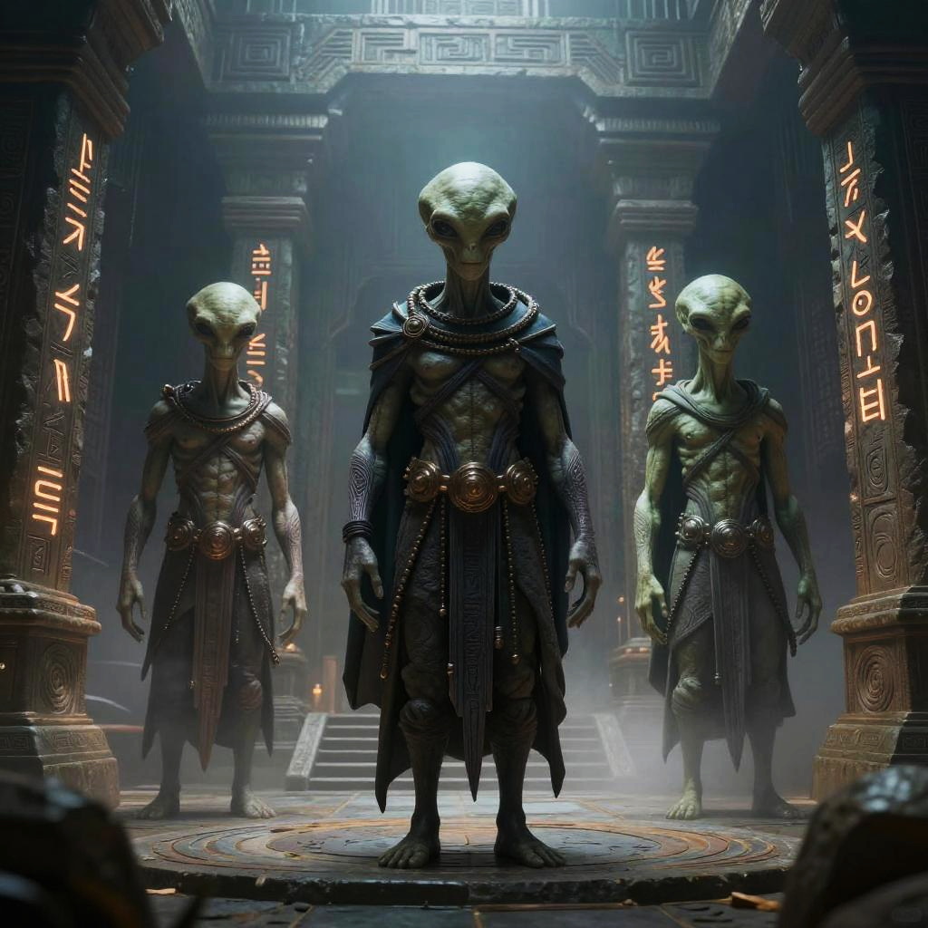 3 boobed alien as a mysterious wise figure in an ancient alien temple, carved stones with glowing runes, misty atmosphere, detailed environment, dramatic lighting, fantasy sci-fi blend