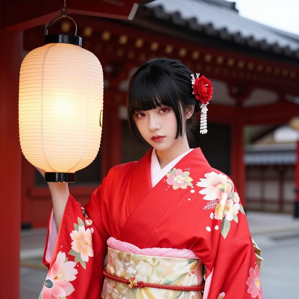 Photograph of an Asian woman in a traditional red and white floral kimono, standing outdoors in a Japanese temple courtyard. She has long black hair adorned with red flowers and tassels, and her pale skin contrasts with the vibrant red of her kimono. She holds a small golden container in her hands. Red lanterns hang overhead, and traditional Japanese architecture with red and white wooden walls is visible in the background. The sunlight casts soft shadows, enhancing the bright colors and details. The image has a slightly stylized, vibrant look.