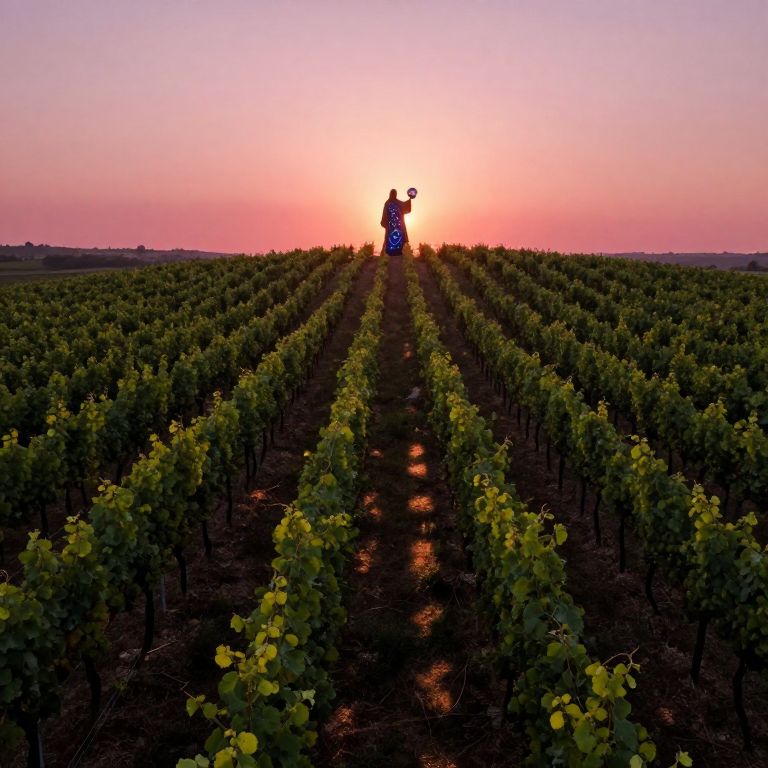 Imagine an awe-inspiring bird's eye view of a tranquil landscape at dusk, featuring a vast vineyard extending towards the horizon under a mesmerizing pinkish sky. The scene is bathed in the warm glow of the setting sun, casting elongated shadows across the verdant green vines and evoking a sense of serenity and warmth. In the distance, an enigmatic figure stands atop a hill, their silhouette stark against the radiant sunset. This mysterious individual dons a flowing robe embellished with celestial motifs, reminiscent of ancient mythological art, while holding a fragile glass sphere that reflects the fading light in an enchanting display. The overall image should captivate viewers with its blend of nature's splendor and the intrigue of an otherworldly presence, inviting them to embark on a fascinating journey through this ethereal panorama.