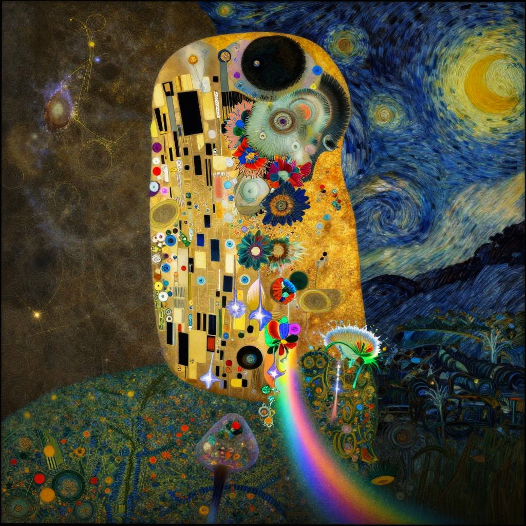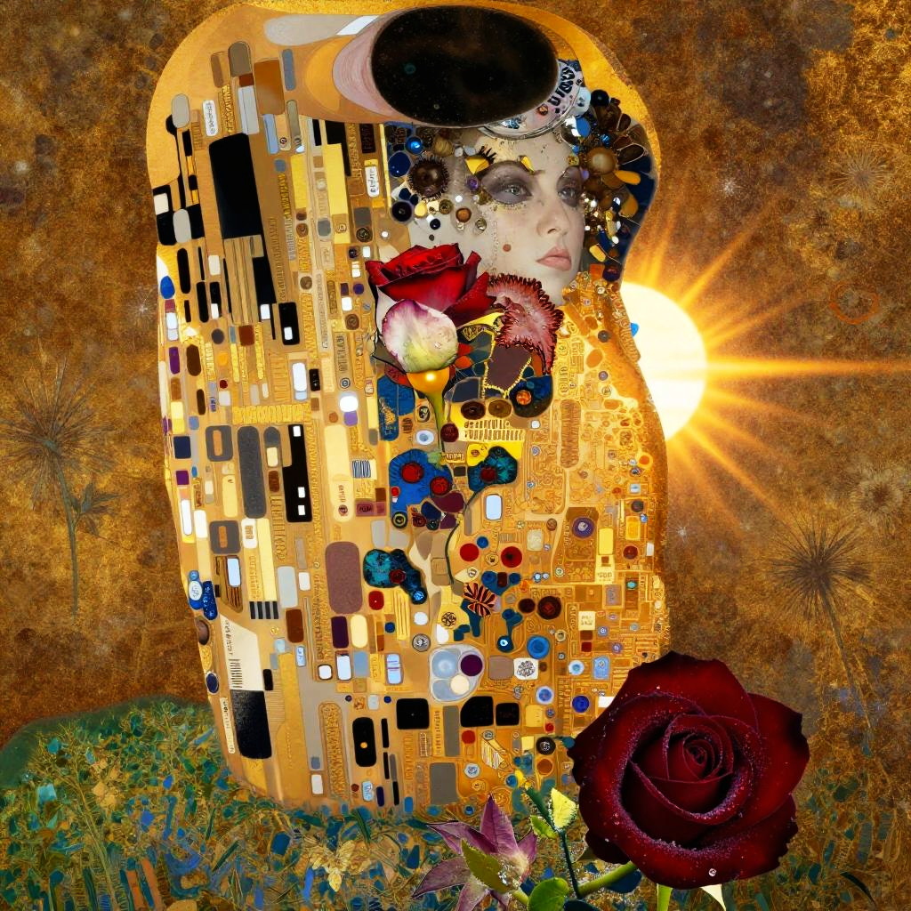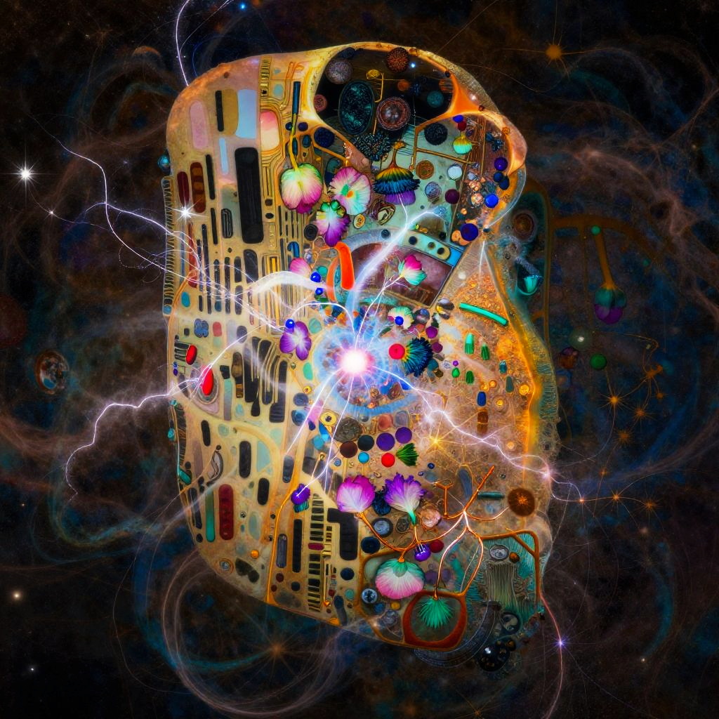 A vibrant, intricate abstract portrait combining elements of surrealism and digital art. The central figure is adorned with colorful, detailed patterns inspired by flowers and circuitry, reminiscent of Gustav Klimt's decorative style. A large sunflower is positioned to the left, while a richly textured background blends cosmic nebula-like effects with fine circuitry detail, creating a brilliant and complex visual composition.