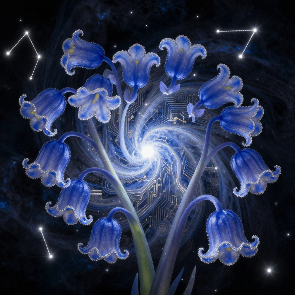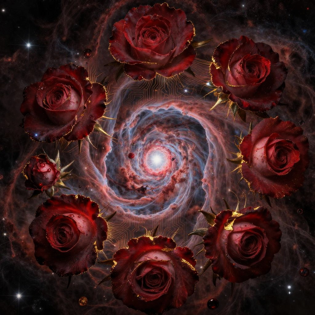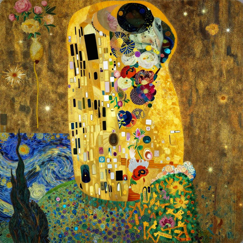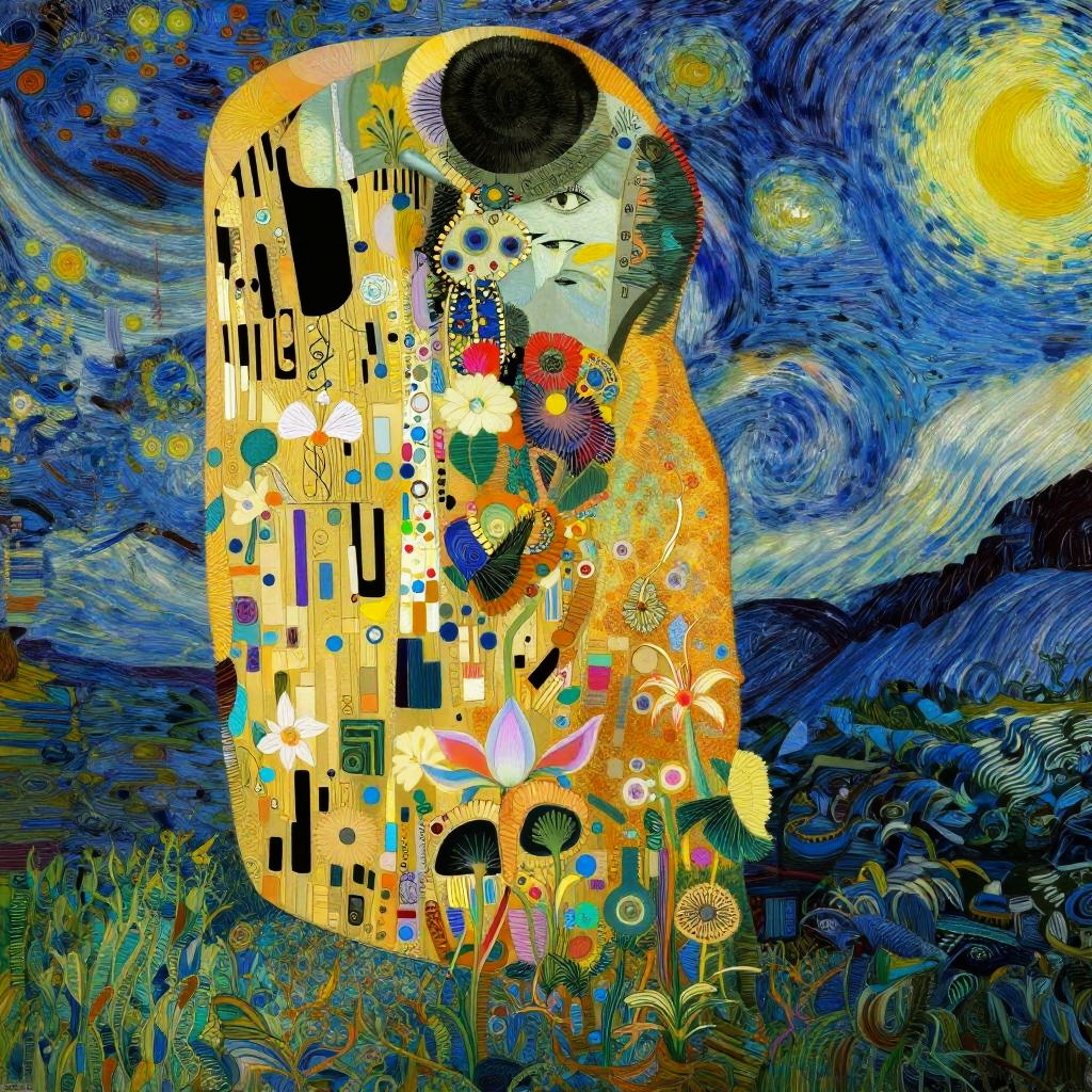 A vibrant, intricate abstract portrait combining elements of surrealism and digital art. The central figure is adorned with colorful, detailed patterns inspired by flowers and circuitry, reminiscent of Gustav Klimt's decorative style. A large sunflower is positioned to the left, while a richly textured background blends cosmic nebula-like effects with fine circuitry detail, creating a brilliant and complex visual composition.