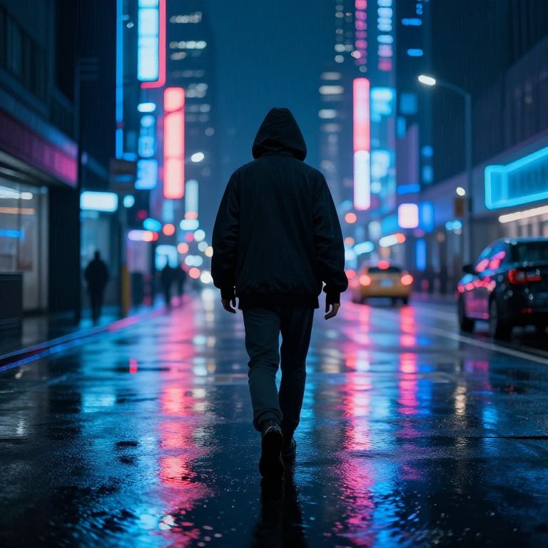 Person with hood up walking through a rainy neon-lit city street at night, reflections on wet pavement, futuristic cyberpunk style, vibrant colors, dramatic lighting, cinematic urban background