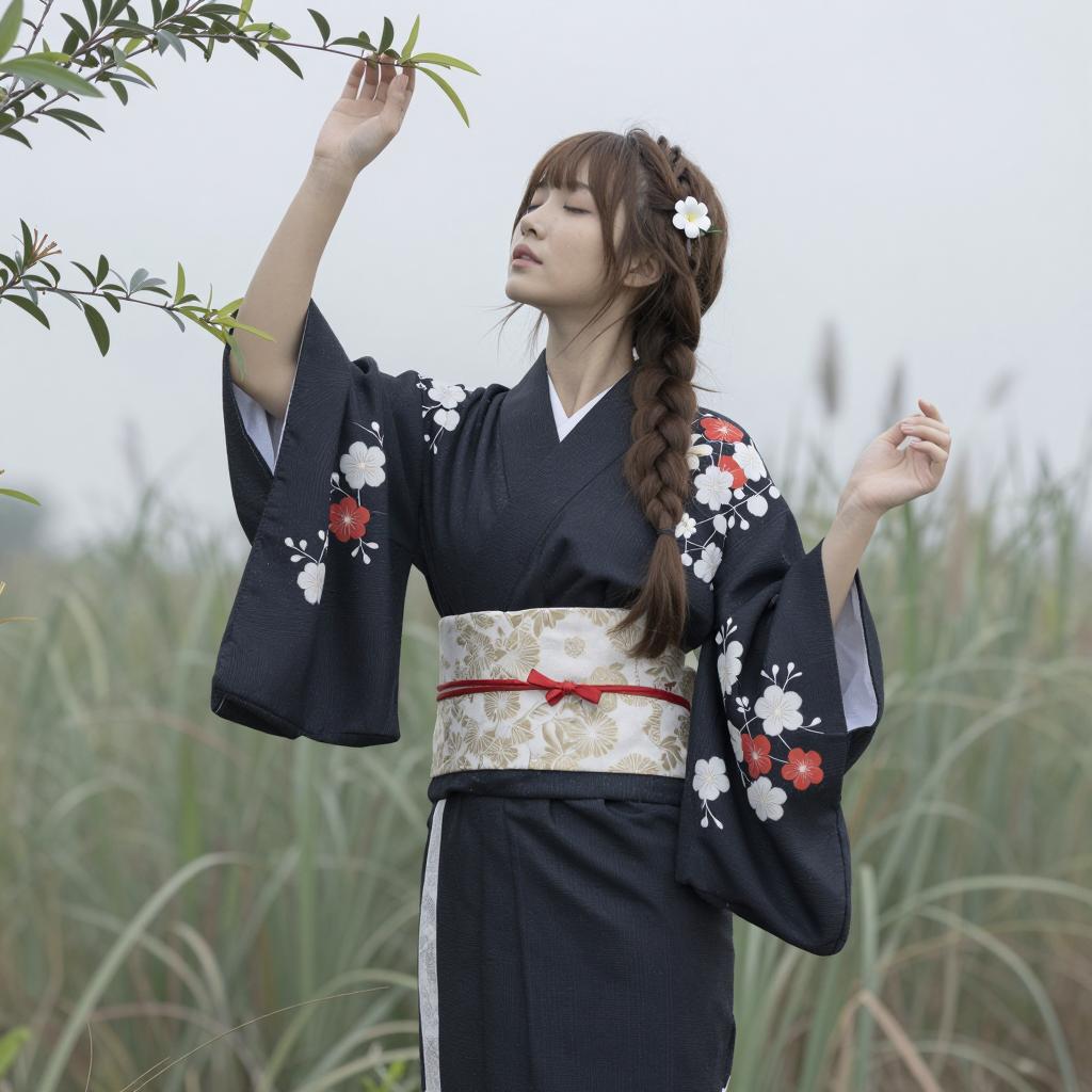East Asian woman wearing a black kimono-style dress with white and red floral patterns and a white obi sash with gold accents and red ribbon. She has brown hair styled in a side braid with a white flower clip. Posing outdoors with hands raised, eyes closed, and lips slightly parted. The background features green leafy branches and tall reeds under an overcast sky with natural lighting.