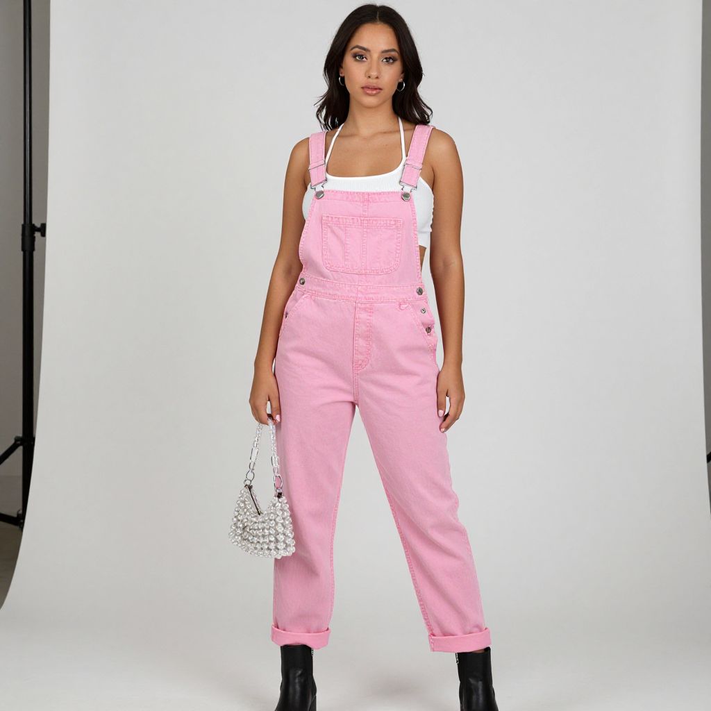 "Woman, casual streetwear, pink cotton overalls with silver hardware, relaxed fit, cuffed at ankles, worn over a white crop top with thin straps, black ankle boots, small silver hoop earrings, clear beaded handbag, white backdrop in a photo studio setting.. Sexy. Pretty face and beаutiful eyes. Big breasts."