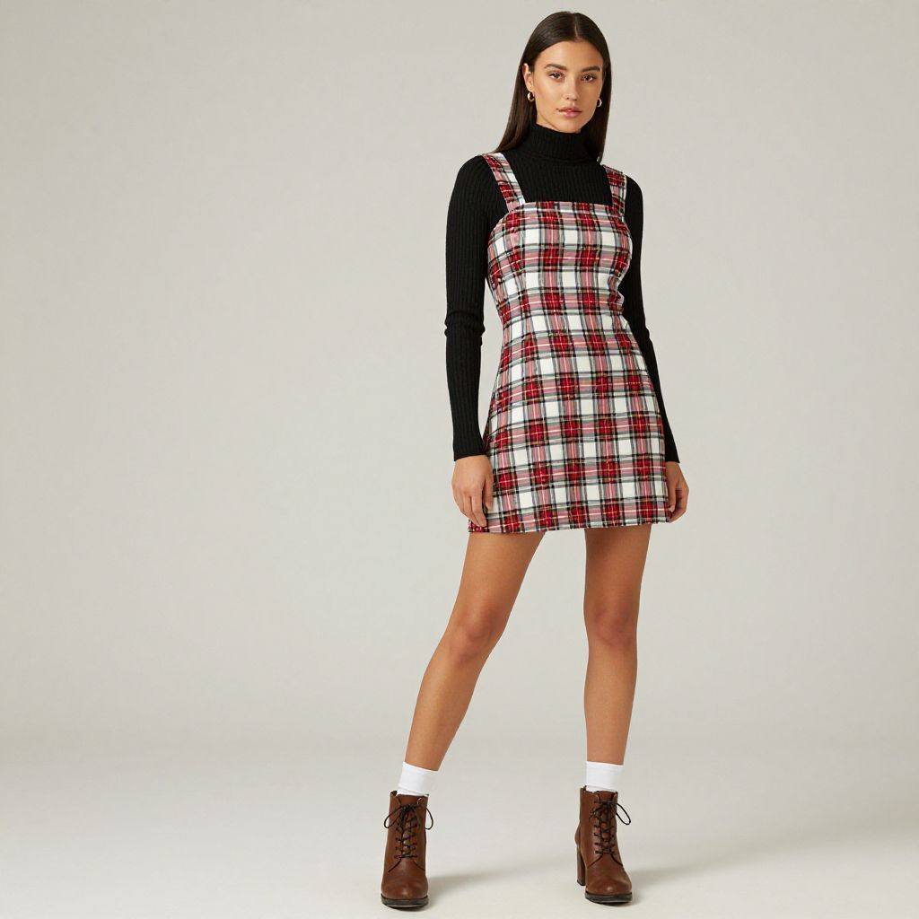 Woman in Preppy Plaid Mini Dress and Turtleneck