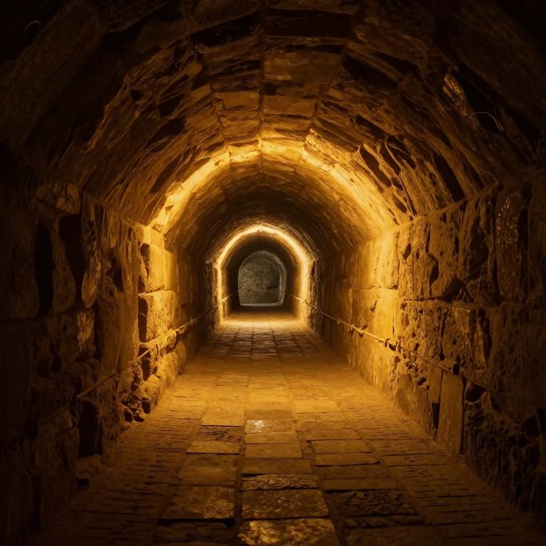 Photograph of a dimly lit, arched stone tunnel with warm yellow lighting, leading to a small, shadowy archway at the end.