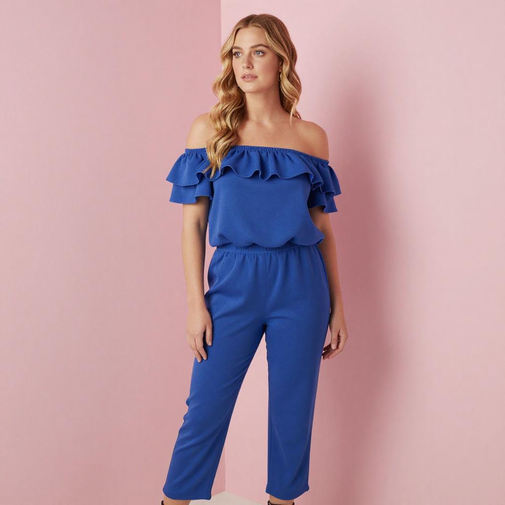 Photograph of a young woman with long, wavy blonde hair, wearing an off-the-shoulder, vibrant blue top with ruffled sleeves and a matching blue skirt. She stands against a soft pink background, looking over her shoulder with a slight smile. Her hands are gently clasped in front of her.