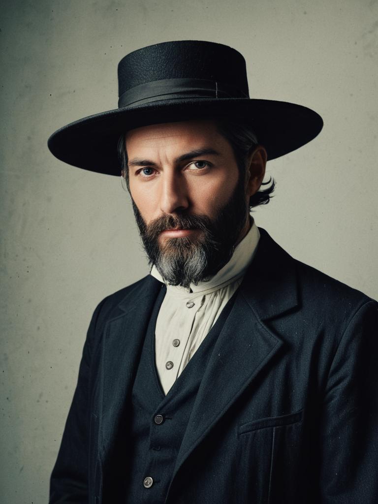 Man in Amish costume, professional cosplay studio portrait, sharp textures