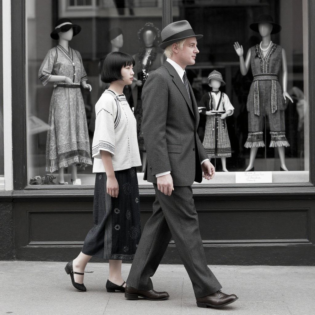Walk Cycle 1920s San Francisco. Blonde man, classy, suit, fedora, walking next to a young chinese woman wearing traditional clothing. They are window shopping.,