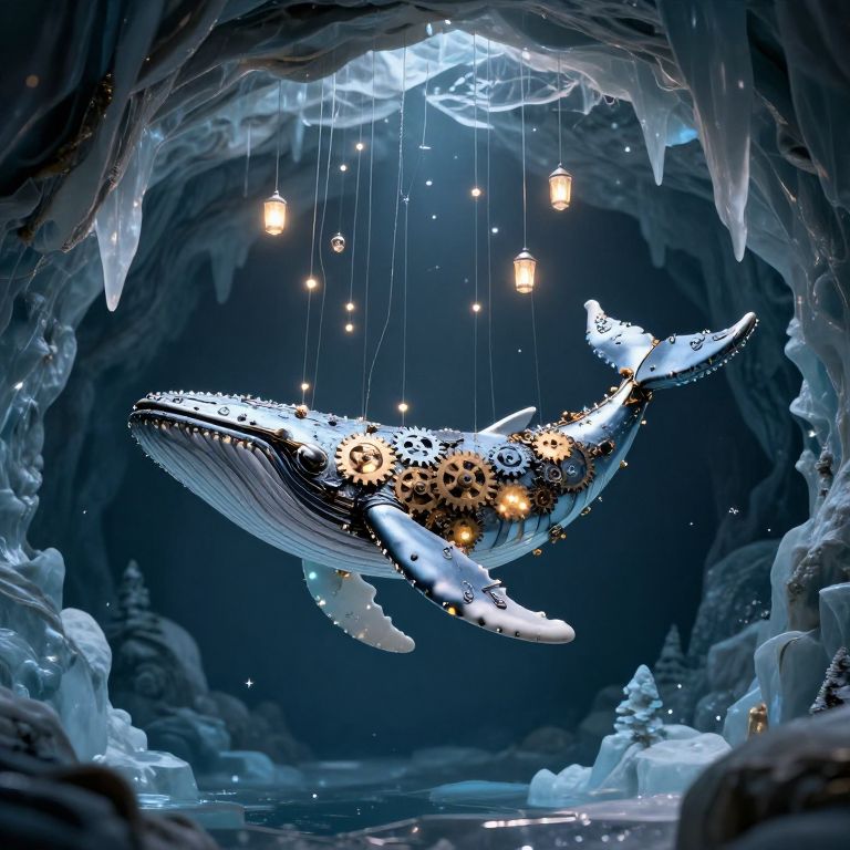 A mechanical whale, adorned with intricate gears and glowing lights, gracefully swims through a cavernous tunnel of ice, suspended by delicate threads of light that dangle like celestial lanterns against the dark, star-studded backdrop.