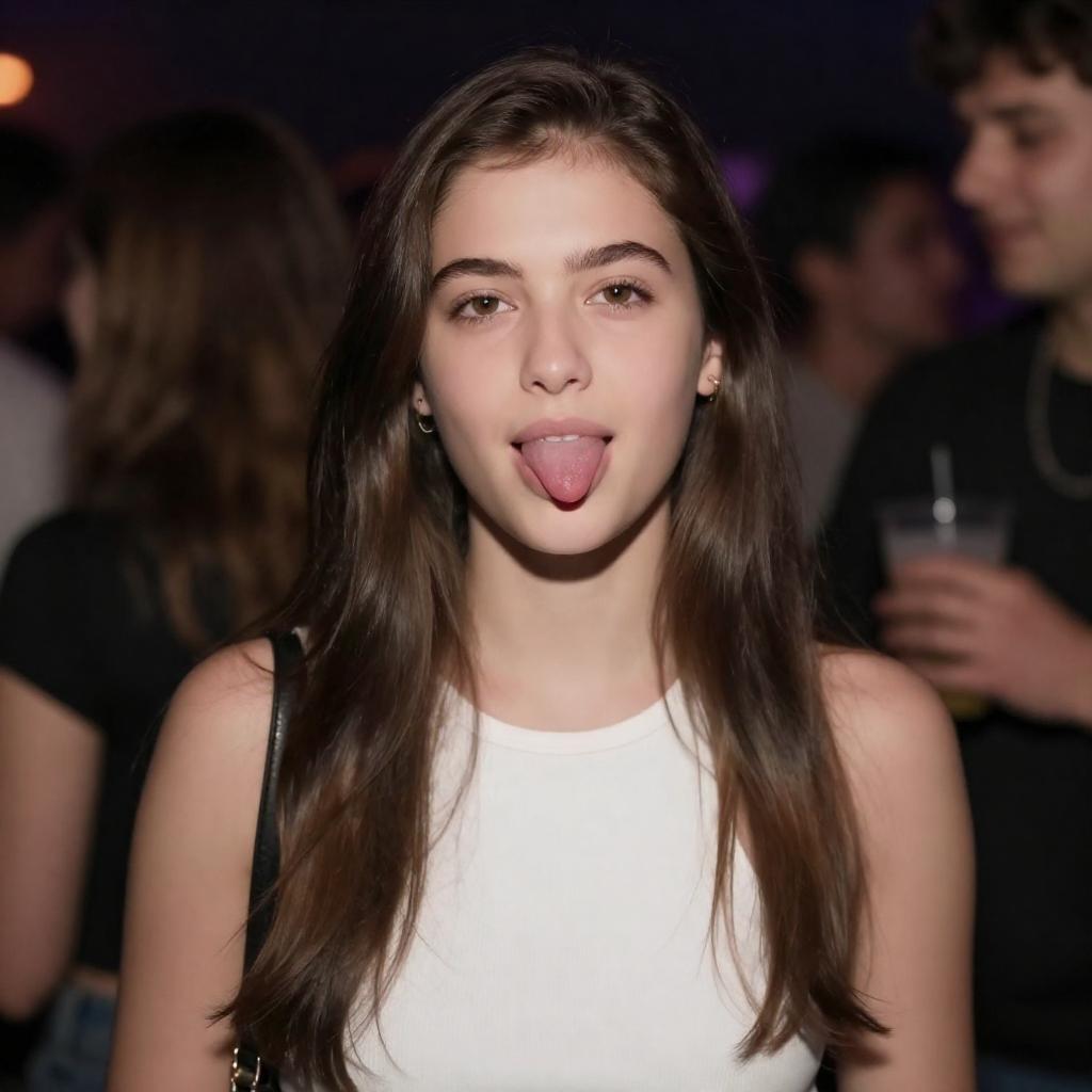 Photograph of a woman with long brown hair, wearing dark sunglasses, licking a lollipop, in a dimly lit room. Another woman with long dark hair, smiling, stands in the background. Doorway and white door in the background.