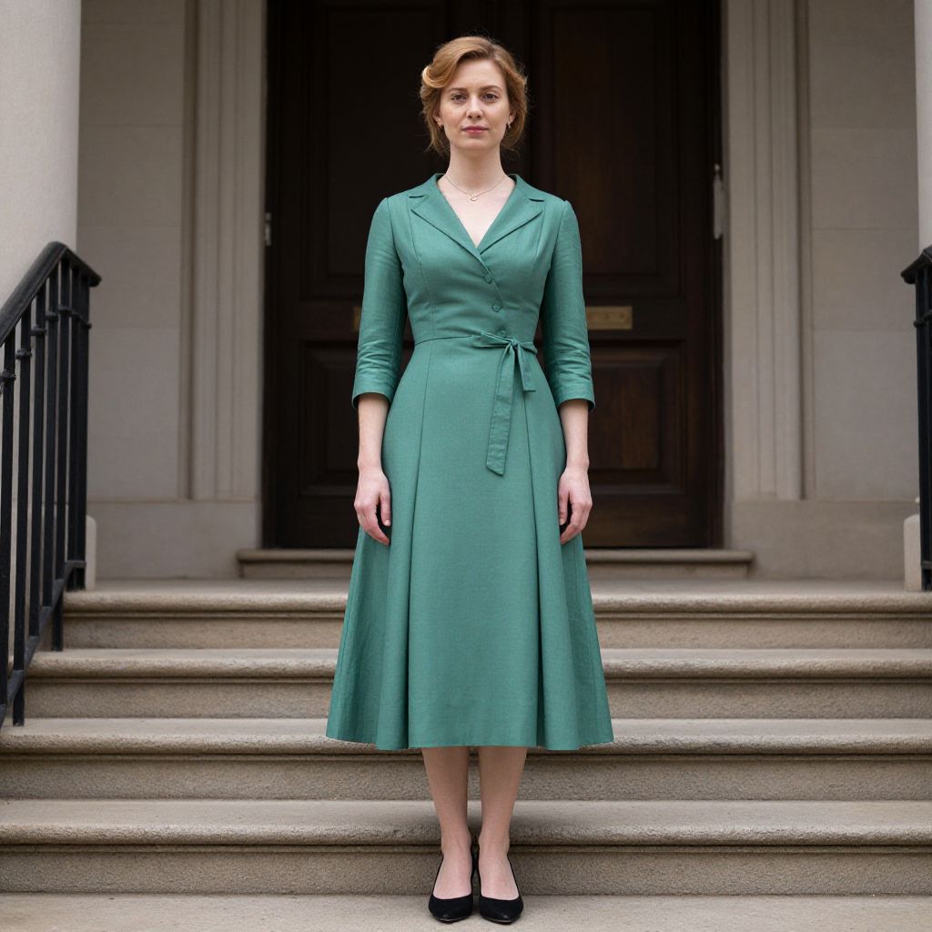 Photograph of a fair-skinned woman with light brown hair styled in an elegant updo, standing on stone steps in front of a dark wooden door. She wears a teal, long-sleeved, knee-length dress with a button-down front and tie at the waist, paired with black flats. The background includes a white building with black railings on the left and a light gray wall on the right. The woman stands confidently with a slight smile, hands relaxed by her sides. The lighting is natural, highlighting her dress's smooth texture.